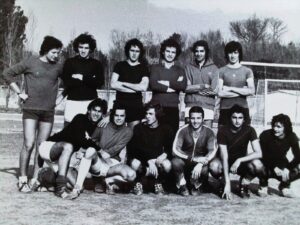 E siccome la storia dei campi e campetti di Ancona l’ha fatta benissimo Anconopoli, io posso concludere il mio personale ricordo di questi luoghi del cuore con un altro campetto e con una foto. Il campetto era quello di Villa Longhi, la casa di campagna della famiglia dei miei amici di sempre Alberto e Giorgio Longhi. Lì per anni ogni domenica mattina nel periodo della scuola si giovava a pallone tra amici nel giardino della casa con un albero in mezzo. Le partite finivano tipo 32 a 28, duravano ore e finivano con le salsicce cucinate al camino. In casi così ti viene da dire quella frase stupida, ma spesso vera, “eravamo felici, ma non lo sapevamo”. In quel giardino sono nate amicizie che ancora durano ed è bello ricordarlo. Amicizie che poi ogni tanto scendevano in campo grande, come quello di Vallemiano dove è stata scattata la foto qui sotto, tanto bella quanto struggente perché c’è qualcuno che ha “lasciato la squadra”, ma continua a vivere nel ricordo dei compagni.