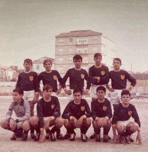 Il campetto del Sacro Cuore era un centro di aggregazione formidabile con le sue particolarità, come il frequente lavaggio nel piazzale della macchina del famosissimo Padre Bernardino, figura notissima nel quartiere e in città, lavaggio curato da una Professoressa del Liceo Classico, la professoressa Chiarugi (sempre che la mia memoria funzioni). Un anno feci lì il chierichetto per tutto il mese di maggio, come del resto imponeva il mio nome, Claudio Maria. Ma le parrocchie a quel tempo offrivano anche molto altro, come, nel caso del Sacro Cuore, la prima sede del Gruppo Scout Ancona 3 e il cinema con la proiezione domenicale pomeridiana di un doppio film. Sui gradoni del campo da pallacanestro si giocava nelle pause tra una partita e l’altra a “scalino” con le figurine dei calciatori (le Panini, obviously): a turno i due contendenti (non mi ricordo se i contendenti potevano essere anche più di due) facevano scivolare a terra una figurina dalla superfice del gradone. Vinceva chi riusciva a coprire con il lancio di una sua figurina un pezzo di una (non più di una, se ricordo bene) figurina già a terra. Ma il campetto era soprattutto il posto dove giocare ore e ore “a pallò” o con le porticine o le porte (a fare da pali maglie e borse). Il campetto aveva la sua “nazionale” come confermato da una meravigliosa foto mandatami da Paolo Stacchiotti in cui c’era una squadra, la Tiger, che schierava tutti ragazzi del campetto: in piedi Belvederesi, Caselunghe, Rossi (Alberto), Stacchiotti e Rossi (Fausto) con seduti Cortucci, io, Ansevini, Reni e Marinelli. Il campo era forse quello di Vallemiano o Piazza d’Armi.
