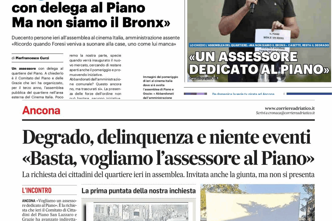 ARTICOLI La città che respiraIl vestito green dell’imperatore nudo03/10/2025by Agnese Riccardi EventiFare cose, vedere gente02/10/2025by Redazione La città che si rigeneraUniversità: immatricolazioni in aumento, ma da città e Regione le risposte sono insufficienti26/09/2025by Redazione InterventiLa città che respiraPlastic Free difende il Comune: un errore non cancella un percorso fatto di impegni misurabili26/09/2025by Redazione SportStoriaLa funzione sociale dello sport: la storia ultracentenaria della SEF Stamura26/09/2025by Massimo Pacetti EventiFare cose, vedere gente25/09/2025by Redazione EditorialeUn nuovo podcast di informazione: Paccasasso!19/09/2025by Redazione La città che respiracaro diarioL’impegno di Ancona per l’ambiente? Un mare di plastica!19/09/2025by Carlo Maria Pesaresi InterventiLa città che collaboraIl Piano non è il Bronx (e non deve diventarlo…)19/09/2025by Andrea Grassini La città che collaboralibriSe la tolleranza minaccia la democrazia: l’incontro con Antonio Nicita alla Mole19/09/2025by Enrico Turchetti Cerchi un articolo?