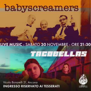 Sabato 30 novembre, Circolo Erèsia, a partire dalle 21:30, live dei Babyscreamers (Ancona) e Tacobellas (Modena). Prima e dopo i concerti Dj Set selection by Caps&Tuna/Motorik Selektors