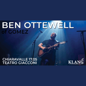 La rassegna Klang porta a Chiaravalle il co-fondatore, voce e chitarrista dei Gomez, Ben Ottewell, in Italia per il suo nuovo tour acustico. Suonerà sia i brani della sua carriera solista sia le perle dei Gomez da dischi culto come “Bring It On”, e “Liquid Skin”. La voce profonda e fuori dal tempo di Ottewell e la sua tecnica chitarristica sono elementi unici e imprescindibili per i suoi show intimi, sempre toccanti e di altissimo livello emotivo.