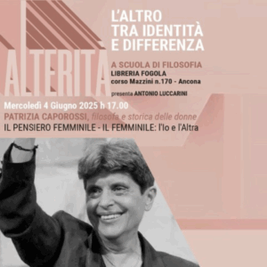 Continuano gli appuntamenti con “A scuola di filosofia”, l’appuntamento di mercoledì 4 giugno (ore 17) alla libreria Fogola è con Patrizia Caporossi, filosofa e storica delle donne per approfondire il tema dell’alterità dalla prospettiva femminile.