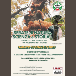 Sempre sabato 31 gennaio (ore 18) alla Casa delle Culture si parla di “Un mondo verticale: il valore delle foreste vetuste dell’Appennino” con Andrea Catorci e Sara Moscatelli (Università di Camerino). Ingresso libero. Durante l’incontro è possibile tesserarsi al Circolo “Il Pungitopo” di Legambiente.