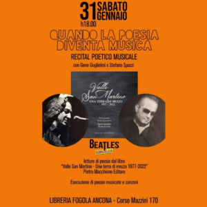 Sabato 31 gennaio alle 18 la libreria Fogola ospita il recital poetico musicale “Quando la poesia diventa musica” letture di poesie tratte dal libro “Valle San Martino – Una terra di mezzo 1977-2022”. Con Gene Guglielmi e Stefano Spazzi. In collaborazione co Beatles Senigallia.
