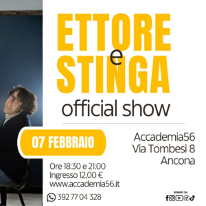 Ettore Budano e Stefano “Stinga” Calabrese sono partner artistici da oltre vent’anni. Sabato all’Accademia 56 proporranno le loro situazioni e i personaggi di fronte ai quali è impossibile rimanere seri. “Ettore e Stinga Official Show” è uno spettacolo inedito che fonde lo show radiofonico dal vivo con pièces teatrali e situazioni comiche. Ore 18:30 e 21:00