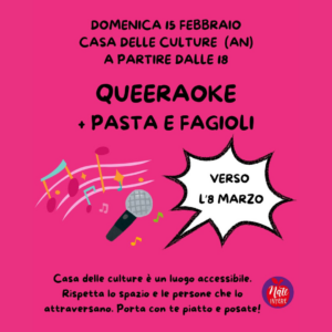 Domenica 15 febbraio dalle ore 18.00 a Casa delle Culture c’è QUEERAOKE: canzoni senza sessismo, razzismo, abilismo, accompagnate da pasta, fagioli e bevande. Evento di Nate Intere in avvicinamento all’8 marzo. Portare da casa piatto, borraccia/bicchiere e posate!