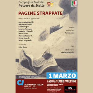 Domenica 1 marzo, ore 18:00, al Teatro Panettone va in scena “Pagine Strappate” della Compagnia Polvere di Stelle. Ricavato devoluto all’Associazione Alzheimer Marche ODV