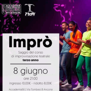 Si intitola Imprò lo spettacolo del terzo corso di improvvisazione teatrale di Teatro Terra di Nessuno presenta. Domenica 8 giugno ore 21, con De Rosa Giuseppe, Fazi Diego, Fiorani Valentina, Galli Azzurra, Giacometti Davide, Mancini Nicoletta, Riva Alessandra, Sebastianelli Leonardo, Sturba Raffaella, Ursi Angela.
