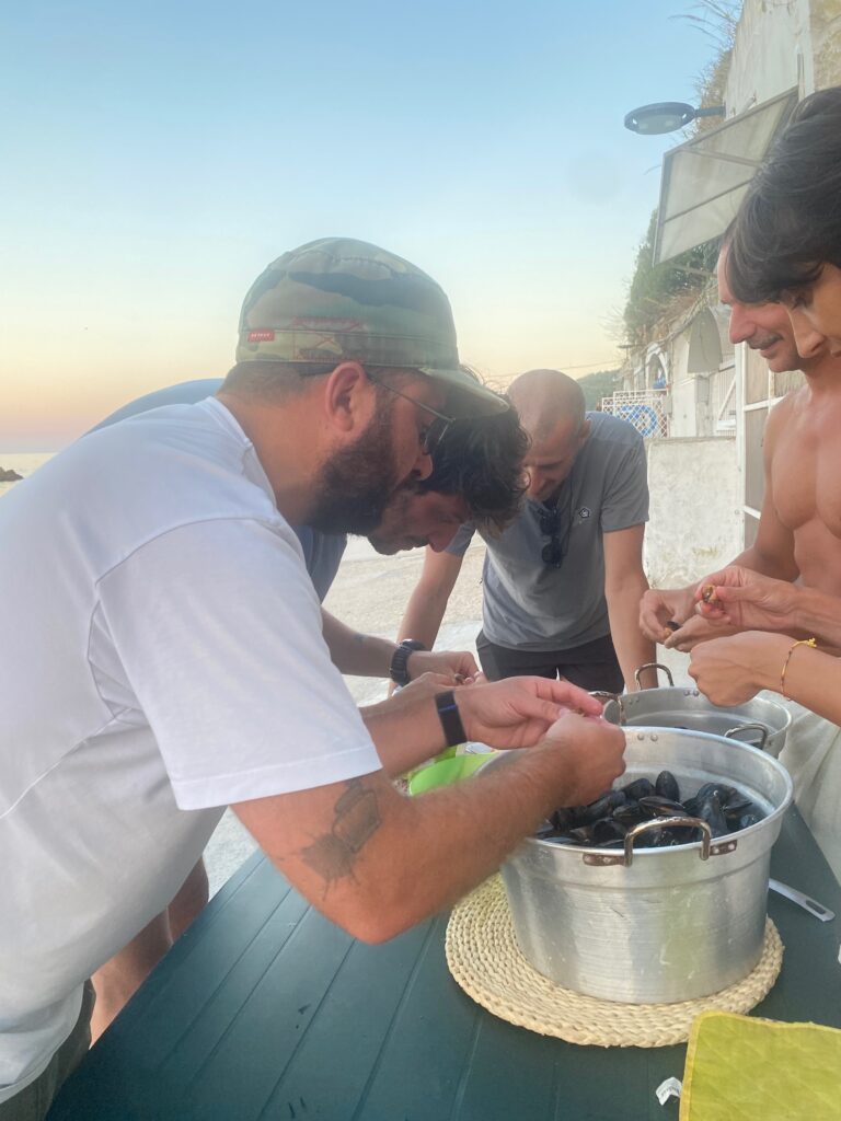 -> Seconda scena. Vengono degli amici da Roma a trovare mio figlio e la compagna che li vogliono portare là dove si esprime il famoso spirito della città, alle grotte del Passetto appunto. Lì un amico di mio figlio con la grotta fa vivere ai due romani l’esperienza magica di una cena con pulizia dei moscioli, cottura degli spaghetti e consumazione degli stessi con stile “me te magno” alla Alberto Sordi. La stessa scena mio figlio e la compagna l’avevano fatta vivere a degli amici americani in un’altra grotta alla Grotta Azzurra. Qui anche alici scottadito e successo garantito. Scena che a me l’ha fatta vivere più Andrea (grazie!!).