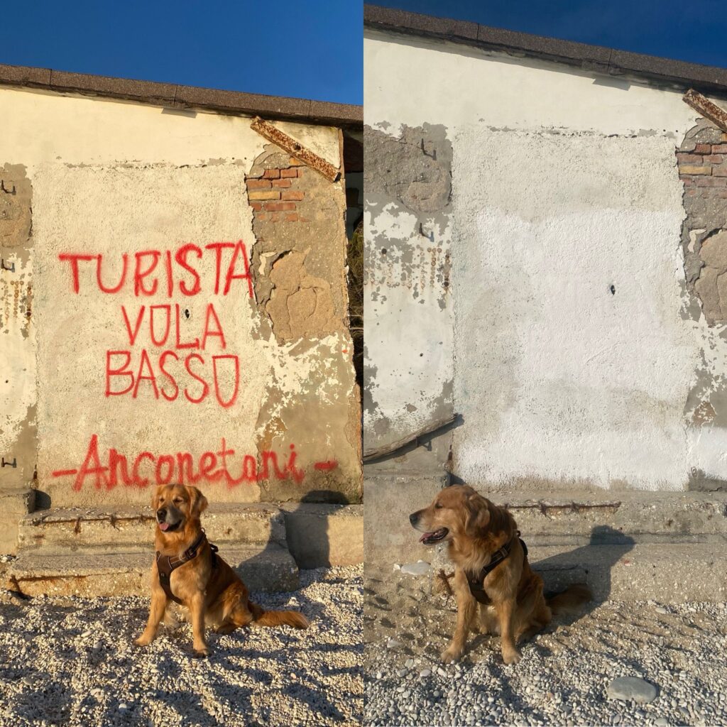 Ho mandato subito la foto a Matteo proponendogli un pezzo sul tema della ospitalità degli anconetani che sfruttasse il supporto iconografico della foto. Ed ecco qua che a scriverne sono proprio io, subito individuato come futuro capro espiatorio delle polemiche che inevitabilmente il pezzo farà nascere se sarà degno di essere letto. Tra l’idea e l’esecuzione ecco che miracolosamente qualcuno ha provveduto intelligentemente a cancellare la minacciosa scritta, con un effetto “sepolcro imbiancato” che è quasi un invito adesso a scriverci su qualcos’altro. Vabbè, meglio di niente, ma intanto la considerazione di fondo resta: questa città, che sempre di più pare voler investire sul turismo, è una città ospitale?