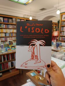 Si tratta della storia di un uomo che ha rinunciato a tutto ed è andato a vivere da solo su un’isola piccolissima. Un uomo che ha chiarissimo cosa sia realmente importante, ma forse si sta anche mentendo un po’, per non pensare a ciò che ha perso con la sua scelta radicale di indipendenza e distanza dalle cose. Però l’Isolo “vive solo, circondato dal mare” e l’autore ci ricorda che questo vale per tutti noi. L’Isolo è un uomo che ha volontariamente rinunciato a tutto -non vuole puù avere niente a che fare con la società. Per passare il tempo immerge la faccia nell’oceano e guarda i fondali “la televisione di Dio”. E quando arriva un messaggio in una bottiglia…contro la curiostà non lo legge, se lo mette in testa a moh di cappellino asserendo “La civiltà qui è bandita…ecco qua un bel cappellino.. unico modo per mettervi in testa la vostra cultura” – Come al solito il fumettista di Grottammare ci lascia sgomenti, perché nella sua atroce semplicità squarcia il quotidiano e ci fa sentire così tremendamente nelle sue strisce. Adoriamo Maicol, la sua famiglia, il suo modo diretto e onesto di stare nel mondo del fumetto e sulla Terra in generale. Un libro in cui non ci si dimentica di un aspetto dolce e non consueto in questa epoca cinica: che esiste una speranza, anche in mezzo al mare.