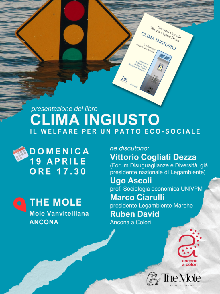 Domenica 19 Aprile, alle ore 17:30, al The Mole, il caffè letterario della Mole Vanvitelliana, la nostra associazione Ancona a Colori organizza la presentazione del libro “Clima ingiusto. Il welfare per un patto eco-sociale” (Donzelli, 2025) di Vittorio Cogliati Dezza, già presidente nazionale di Legambiente, e Giovanni Carrosio, docente di Sociologia dell’ambiente e Sistemi a rete, territorio e sviluppo all’Università di Trieste, entrambi membri del coordinamento del Forum Disuguaglianze e Diversità. Oltre ad uno degli autori, a discuterne ci saranno anche Ugo Ascoli, già professore di Sociologia economica presso Univpm, Marco Ciarulli, presidente Legambiente Marche, e il nostro Ruben David, che qui introduce il libro e il tema trattato.