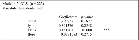 Come si vede, ci sono tre variabili principali: il reddito (ly), la densità abitativa (ldens) e la presenza di cittadini stranieri (lfore), oltre a una “costante” (const), che può essere pensata come un punto di partenza.