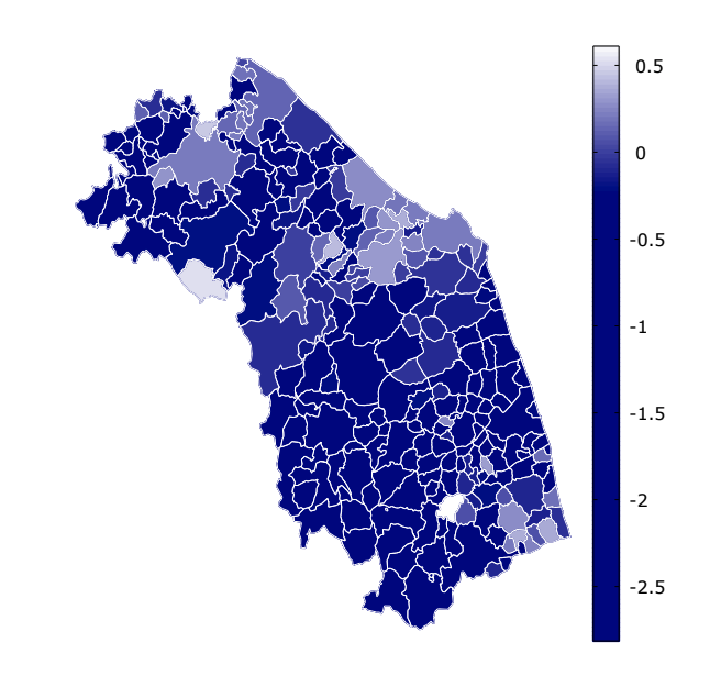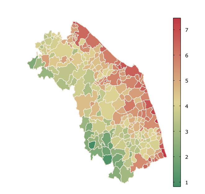 Basta uno sguardo per cogliere le prime differenze. Le aree tendenti al bianco indicano i comuni in cui prevale Ricci, mentre le tonalità più blu segnalano i territori in cui è Acquaroli a ottenere la maggioranza dei voti. Nel complesso, emerge un quadro piuttosto netto: nella maggior parte della regione il vantaggio è di Francesco Acquaroli, soprattutto nelle aree interne. Al contrario, i risultati migliori di Matteo Ricci, pur con alcune eccezioni anche nell’entroterra, si concentrano soprattutto lungo la fascia costiera. Il consenso, quindi, non si distribuisce in modo uniforme, ma sembra seguire una precisa geografia territoriale. La cartina lo mostra con immediatezza, ma allo stesso tempo suggerisce una domanda inevitabile: da cosa nascono queste differenze?