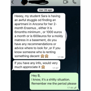Intanto, mentre i numeri rimbalzano tra conferenze stampa e interviste, la realtà è che studenti, soprattutto internazionali, continuano a incontrare ostacoli concreti: richieste di affitto rifiutate, garanzie impossibili da fornire, truffe online. A colmare questo vuoto spesso non è la politica, ma i giovani ricercatori, dottorandi e assegnisti che si trovano ad aiutare i nuovi arrivati a districarsi in un mercato abitativo sempre più ostile cercando posti letto, dialogando con gli affittuari, accompagnando gli studenti dalle forze dell’ordine per denunciare truffe e aiutando nella traduzione delle lingue. Un impegno prezioso, ma che non dovrebbe ricadere sulle spalle di chi dovrebbe concentrarsi sulla ricerca.
